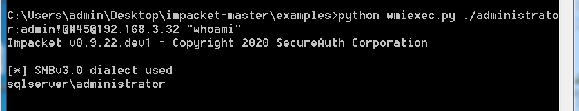 通过该命令成功获得一个交互式的shell,那么wmiexec.py也可单执行命令。