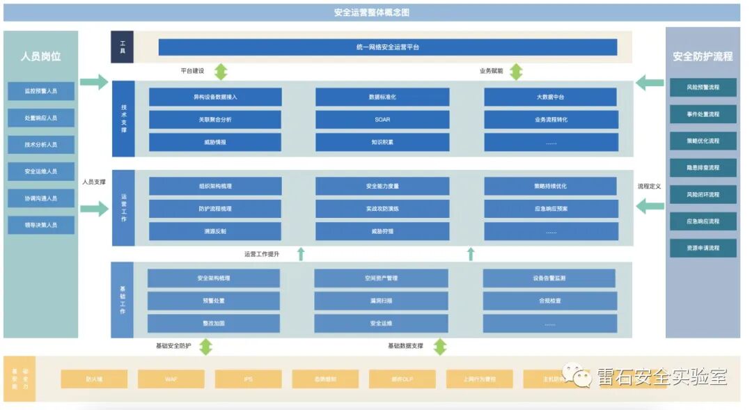 在不同的网络安全运营建设阶段,重点开展的工作也并不相同,按照实际工作中自身参与的部分工作进行梳理,形成了网络安全运营整体概念图,由基础安全设备提供安全能力,人员作为运营核心,流程作为保证,共同。