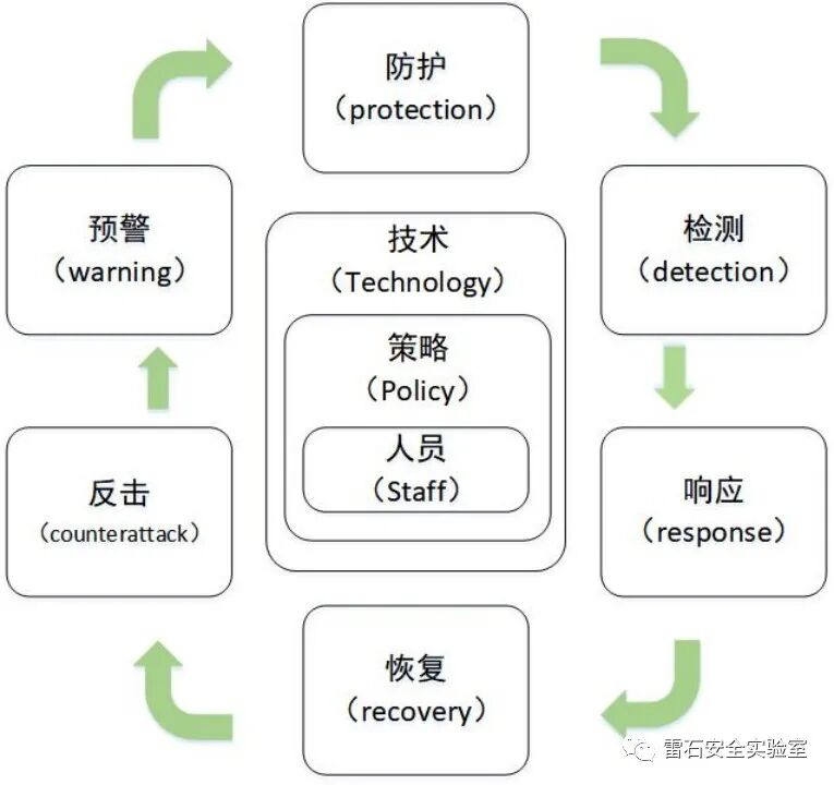 WPDRRC模型是信息安全专家提出的适合中国国情的信息系统的安全保障体系建设模型,包括六个环节和三大要素,六个环节包括预警、防护、检测、响应、恢复和反击,具有较强的时序性和动态性,可以反映出信息系统安全运营体系的能力。三大要素包括人员、策略和技术,人员是核心,策略是桥梁,技术是保证。三大要素落实在WPDRRC模型6个环节的各个方面,将安全策略变为安全现实。