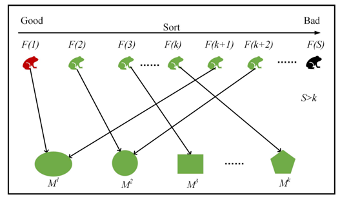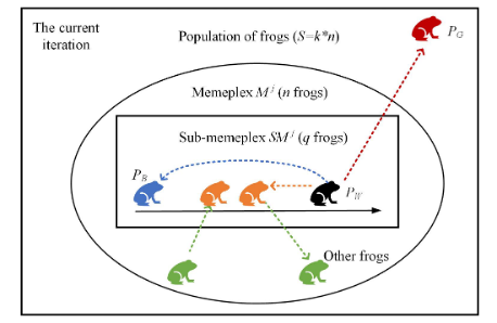 图5给出了一个全局迭代的例子。在每一次迭代循环中,种群S被更新优化以确定最优青蛙(红青蛙),M^j是包含n只青蛙的区域,在每一次迭代中从n只青蛙中选择q只青蛙以形成SM^j,并且在一次迭代之后SM^j中的青蛙和M^j中的其它青蛙被更新和交换(绿色青蛙)。SM^j中的青蛙被排序以获得局部最优青蛙(蓝色青蛙)、局部最差青蛙(黑色青蛙)和其他青蛙(橙色青蛙)。另外,红色、橙色和蓝色虚线表示P_W的三种类型的LUM,具体内容如下所述: