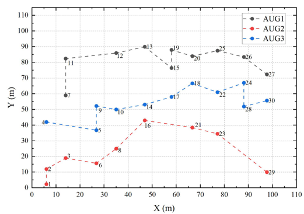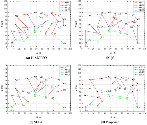 为了进一步分析详细的过程,在下面的图8中比较了使用四种算法规划的路径,其中三个AUG在100m×100m 区域中工作,并生成30个交互点。