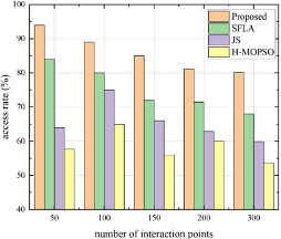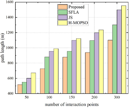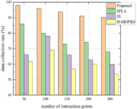 通过图7可以发现,在路径长度和访问率方面,所提出的HSPP-HA 展示出了预期的最高性能,并且SFLA紧随其后,这证明了时空聚类对本文的任务模型的适应性。H-MOPSO和JS示出较低的性能,因为它们的机制中每个交互点的时间和空间属性不相关,从而混淆路径规划决策。由于采用了自适应迭代方法,所提方法优于SFLA。特别是在数据收集率方面,由于自适应迭代因子很好地平衡了全局和局部搜索,因此与原始SFLA相比,其显示出显著的改进,其中在300个交互作用点的情况下,数据收集率增加了20%以上,在50个交互作用点的情况下,数据收集率达到98%。