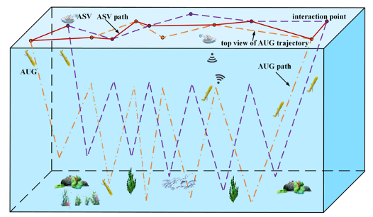 海洋探索是人类社会可持续发展的根本性问题之一,也是实现智慧海洋城市等水下物联网(IoUT)应用概念的基础。基于水下无线通信的异构自主海洋车辆(AMV)之间的协作是一种可行的海洋探测方法,典型的AMV包括自主水面航行器(ASV)和自主水下滑翔机(AUG)。然而,它们的规格和运动的差异给协同工作带来了以下问题:首先,当AUG浮到一定深度与ASV通过水下无线通信进行交互时,这种交互有一定的时间限制,它们运动到交互位置必须同步;其次,在多个AUGs同时进行水下探测的情况下,ASV需要规划水面交互的顺序,以保证及时、高效地数据采集。本文所要解决的问题场景如图1所示。为此,提出了一种面向异构AMVs数据收集的启发式表面路径规划方法(HSPP-HA),为ASV规划一条低路径成本、高数据收集的访问路径,解决了交互点具有时效性的问题。