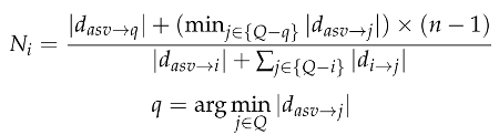 其中,d_{a→b}是a和b之间的距离;Q是围绕i并遵循位置(速度)约束的交互点的集合;j是Q中的每个交互作用点;n是Q中交互作用点的数目。下面的图3示出了ASV决定要访问的交互点的示例情况,其详细描述了Ni的含义。