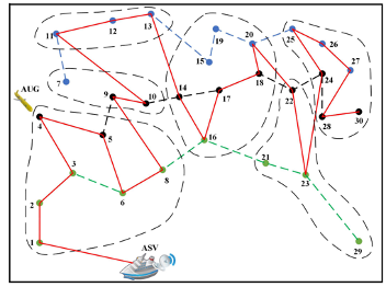 图6示出了由多个AUGs生成的交互点的示例。虚线表示AUG轨迹的俯视图,图中交互点按数字顺序出现,经过一定时间后消失。每个AUG在其浮动到交互点时携带一定量的数据,并且如果ASV错过交互作用,则AUG将把数据缓存到下一交互点。但是本文仿真最多缓存三次,因为在超过三次缓存的情况下,缓存的数据超过一个交互周期的可传输量,这会导致数据丢失。目标是规划ASV在海面上的优化路径,顺序地访问多的交互点同时收集尽可能多的数据。