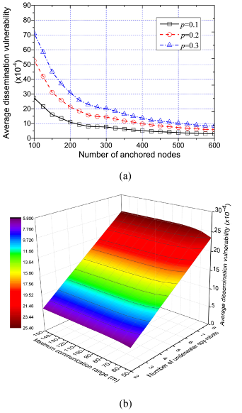在图6(a)中,观察到平均传输脆弱性随着锚节点数量的增加而降低,这是因为当锚节点数量增加时,一些锚节点将承担更多信息中继。本文假设与锚节点相邻的间谍机器人以概率p窃取锚节点所传输的数据信息,图6(a)表明,当p较小时,平均传输脆弱性也较小,这意味着减少p值的有效加密方法可以显著改善锚节点的传输脆弱性。如图6(b)所示,平均传输脆弱性随着最大通信范围的增加而增加,因为锚节点被允许采用更大的通信范围。当最大通信范围足够大时,平均传输脆弱性几乎保持不变,原因是采用最大通信范围的锚节点非常少。