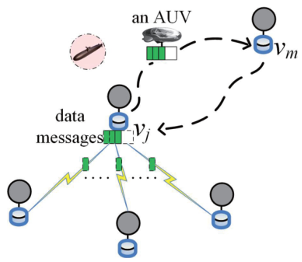 对于传输脆弱性最大的N_a个锚节点,将其通信半径设置为最小值,并分配N_a个AUV分别辅助它们传输信息。假设锚节点v_i需要AUV的辅助,由于v_i只会沿着具有最大路径连通性的路径来传输信息(如图3所示),即v_i的下一跳节点是唯一的,因此AUV只需在v_i处接受信息并航行到下一跳节点处,将信息发送给下一跳节点,然后v_i将已传输到下一跳节点的信息删除,如图4所示。