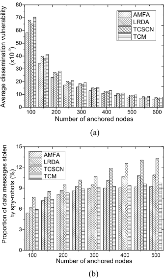 假设每个水下间谍机器人在随机选择的锚节点周围航行,间谍机器人窃取的数据信息的比例计算为被窃取的数据信息的数量与锚节点生成的所有数据信息的数量之比。图9(a)和(b)表明,在平均传输脆弱性和间谍机器人窃取数据信息的比例方面,AMFA明显优于其他算法。原因是AMFA为锚节点的出度分布设计了一个幂律分布,位于上层的锚节点往往被设置更小的通信范围,因为这些锚节点可能承担更多的消息中继。特别地,分配一些AUV作为信息渡船,用于辅助传输脆弱性最大的锚节点的数据信息传输,改善了锚节点的传输脆弱性,有效地降低了数据信息被间谍机器人窃取的比例。此外,在图9(b)中,TCM的被窃取信息比例低于LRDA和TCSCN的,因为TCM应用了数字签名认证来保护数据信息。
