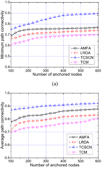 当锚节点数量足够多时,AMFA能够保证所需的拓扑连通性,如图8(a)所示。在图8(b)中,AMFA的平均路径连通性曲线低于TCSCN的,因为TCSCN允许一些节点采用较大的通信范围,因此显著地改善了路径连通性。