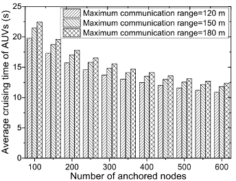 在图7中可以获得两个观察结果:1)AUV的平均巡航时间随着锚节点的增加而减少,因为锚节点部署得越密集,锚节点的通信范围就越小;2)锚节点的最大通信范围越大,AUV的平均巡航时间就越小,因为较大的最大通信范围允许锚节点采用较大的通信范围。