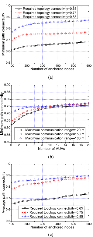 在图5(a)和(c)中,所需拓扑连通性较大的曲线高于具有较小的所需拓扑连通性的曲线,因为较大的所需拓扑连通性使得锚节点的通信范围被设置得较大,因此拓扑连通性得到改善。当锚节点足够多时,可以保证所需的拓扑连通性,并且这些曲线随着锚节点数量的增加而上升,这是由于当部署更多锚节点时,从每个锚节点到水面sink有更多的可用通信路径。从图5(b)中,可获得如下两个观察结果:1)最大通信范围不同的曲线彼此非常接近,这种现象的原因是采用最大通信范围的锚节点的数量非常少,因此,最大通信范围对拓扑连通性没有明显的影响;2)随着AUV数量的增加,曲线保持稳定,原因是:当分配更多的AUV来传输数据信息时,能够得到更大的拓扑连通性。