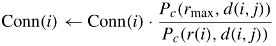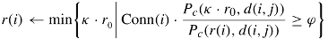 这里通信范围的更新方式有两种:若Conn(i)小于所需的拓扑连通性且 Conn(i)·[(P_c(r_max,d(i,j)))/(P_c(r(i),d(i,j)))](其中P_c为链路存在概率,r为锚节点通信范围,d为两个锚节点之间的距离)大于等于所需的拓扑连通性,采用更新r(i);若Conn(i)·[(P_c(r_max,d(i,j)))/(P_c(r(i),d(i,j)))]小于所需的拓扑连通性,采用