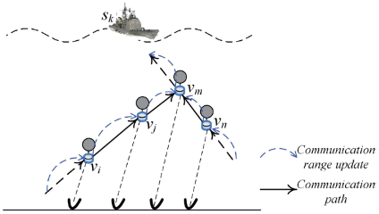 每个锚节点向其他锚节点广播一个包含其自身初始通信范围的通知包,然后,可以找到从其自身到其中一个水面sink的具有最大路径连通性Conn(i)的通信路径。如果Conn(i)小于所需的拓扑连通性,则由下到上地更新该通信路径上所有锚节点的通信范围,以保证Conn(i)大于等于所需的拓扑连通性,如图2所示。