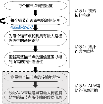 AMFA的操作分为三个阶段:(1)初始拓扑构造;(2)拓扑连通性维持;(3)AUV辅助的信息传输,如图1所示。