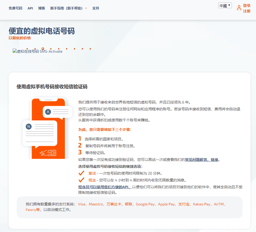 这里推荐一个网站https://sms-activate.org//,我们可以花一块钱左右买到一个 OpenAI 验证的手机号接收一次验证码。(更详细的注册步骤网站里有)