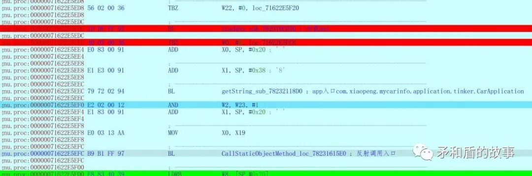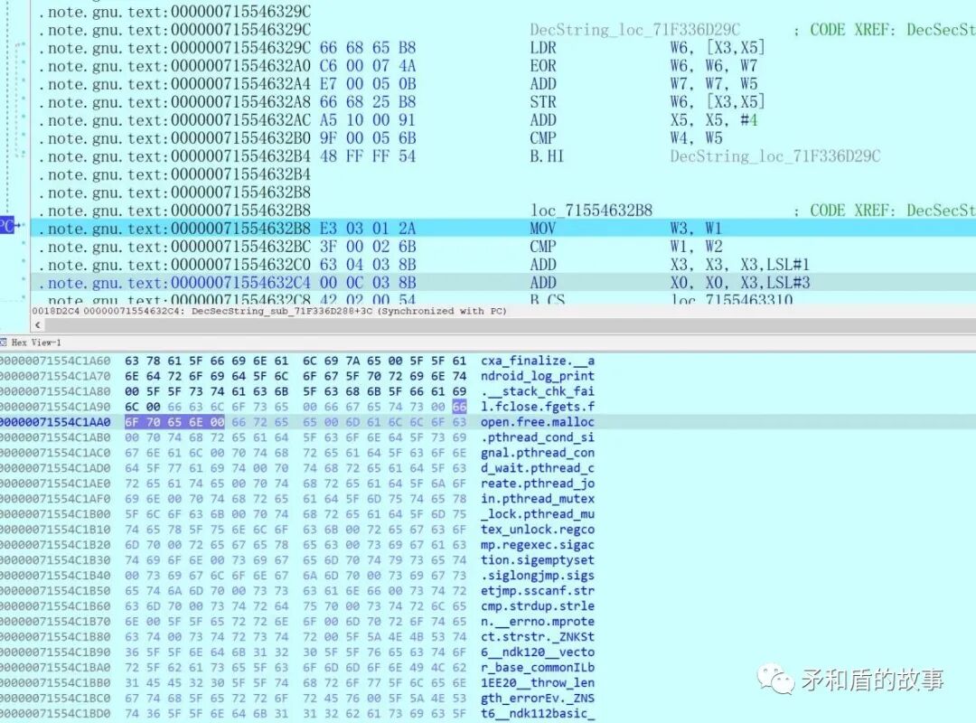 .note.gnu.proc:00000071553EB834 ; 解密dex.note.gnu.proc:00000071553EB834.note.gnu.proc:00000071553EB834 DecDex_sub_71553EB834.note.gnu.proc:00000071553EB834.note.gnu.proc:00000071553EB834 var_60= -0x60.note.gnu.proc:00000071553EB834.note.gnu.proc:00000071553EB834 FD 7B BA A9 STP X29, X30, [SP,#var_60]!.note.gnu.proc:00000071553EB834 ; End of function DecDex_sub_71553EB834.note.gnu.proc:00000071553EB834.note.gnu.proc:00000071553EB838 FC 0B 00 F9 STR X28, [SP,#0x10].note.gnu.proc:00000071553EB838.note.gnu.proc:00000071553EB83C ; ---------------------------------------------------------------------------.note.gnu.proc:00000071553EB83C FA 67 02 A9 STP X26, X25, [SP,#0x20].note.gnu.proc:00000071553EB83C.note.gnu.proc:00000071553EB840 ; ---------------------------------------------------------------------------.note.gnu.proc:00000071553EB840 F8 5F 03 A9 STP X24, X23, [SP,#0x30].note.gnu.proc:00000071553EB840.note.gnu.proc:00000071553EB844 ; ---------------------------------------------------------------------------.note.gnu.proc:00000071553EB844 F6 57 04 A9 STP X22, X21, [SP,#0x40].note.gnu.proc:00000071553EB844.note.gnu.proc:00000071553EB848 ; ---------------------------------------------------------------------------.note.gnu.proc:00000071553EB848 F4 4F 05 A9 STP X20, X19, [SP,#0x50].note.gnu.proc:00000071553EB848.note.gnu.proc:00000071553EB84C ; ---------------------------------------------------------------------------.note.gnu.proc:00000071553EB84C FD 03 00 91 MOV X29, SP.note.gnu.proc:00000071553EB84C.note.gnu.proc:00000071553EB850 ; ---------------------------------------------------------------------------.note.gnu.proc:00000071553EB850 FF 83 11 D1 SUB SP, SP, #0x460.note.gnu.proc:00000071553EB850.note.gnu.proc:00000071553EB854 ; ---------------------------------------------------------------------------.note.gnu.proc:00000071553EB854 5A D0 3B D5 MRS X26, #3, c13, c0, #2.note.gnu.proc:00000071553EB854.note.gnu.proc:00000071553EB858 ; ---------------------------------------------------------------------------.note.gnu.proc:00000071553EB858 48 17 40 F9 LDR X8, [X26,#0x28].note.gnu.proc:00000071553EB858.note.gnu.proc:00000071553EB85C ; ---------------------------------------------------------------------------.note.gnu.proc:00000071553EB85C F9 03 00 AA MOV X25, X0.note.gnu.proc:00000071553EB85C.note.gnu.proc:00000071553EB860 ; ---------------------------------------------------------------------------.note.gnu.proc:00000071553EB860 F3 03 02 AA MOV X19, X2.note.gnu.proc:00000071553EB860.note.gnu.proc:00000071553EB864 ; ---------------------------------------------------------------------------.note.gnu.proc:00000071553EB864 F5 03 01 AA MOV X21, X1.note.gnu.proc:00000071553EB864.note.gnu.proc:00000071553EB868 ; ---------------------------------------------------------------------------.note.gnu.proc:00000071553EB868 A8 83 1F F8 STUR X8, [X29,#-8].note.gnu.proc:00000071553EB868.note.gnu.proc:00000071553EB86C ; ---------------------------------------------------------------------------.note.gnu.proc:00000071553EB86C 36 5C 42 29 LDP W22, W23, [X1,#0x10].note.gnu.proc:00000071553EB86C.note.gnu.proc:00000071553EB870 ; ---------------------------------------------------------------------------.note.gnu.proc:00000071553EB870 38 04 40 F9 LDR X24, [X1,#8].note.gnu.proc:00000071553EB870.note.gnu.proc:00000071553EB874 ; ---------------------------------------------------------------------------.note.gnu.proc:00000071553EB874 E0 03 17 AA MOV X0, X23.note.gnu.proc:00000071553EB874.note.gnu.proc:00000071553EB878 ; ---------------------------------------------------------------------------.note.gnu.proc:00000071553EB878 6A 64 02 94 BL malloc_sub_7D26D81A20.note.gnu.proc:00000071553EB878.note.gnu.proc:00000071553EB87C ; ---------------------------------------------------------------------------.note.gnu.proc:00000071553EB87C E1 03 18 AA MOV X1, X24.note.gnu.proc:00000071553EB87C.note.gnu.proc:00000071553EB880 ; ---------------------------------------------------------------------------.note.gnu.proc:00000071553EB880 E2 03 17 AA MOV X2, X23.note.gnu.proc:00000071553EB880.note.gnu.proc:00000071553EB884 ; ---------------------------------------------------------------------------.note.gnu.proc:00000071553EB884 F4 03 00 AA MOV X20, X0.note.gnu.proc:00000071553EB884.note.gnu.proc:00000071553EB888 ; ---------------------------------------------------------------------------.note.gnu.proc:00000071553EB888 BE 63 02 94 BL memcpy_2 ; 拷贝DEX密文.note.gnu.proc:00000071553EB888.note.gnu.proc:00000071553EB88C ; ---------------------------------------------------------------------------.note.gnu.proc:00000071553EB88C E0 83 00 91 ADD X0, SP, #0x20 ; ' '.note.gnu.proc:00000071553EB890 12 59 00 94 BL DecKEY_sub_7155401CD8.note.gnu.proc:00000071553EB890.note.gnu.proc:00000071553EB894 21 63 04 91 ADD X1, X25, #0x118.note.gnu.proc:00000071553EB894.note.gnu.proc:00000071553EB898 ; ---------------------------------------------------------------------------.note.gnu.proc:00000071553EB898 E0 23 00 91 ADD X0, SP, #8.note.gnu.proc:00000071553EB898.note.gnu.proc:00000071553EB89C ; ---------------------------------------------------------------------------.note.gnu.proc:00000071553EB89C F8 23 00 91 ADD X24, SP, #8.note.gnu.proc:00000071553EB89C.note.gnu.proc:00000071553EB8A0 ; ---------------------------------------------------------------------------.note.gnu.proc:00000071553EB8A0 0C 64 02 94 BL getString_sub_78232118D0 ; 4A7651EA24600BAA.note.gnu.proc:00000071553EB8A0.note.gnu.proc:00000071553EB8A4 ; ---------------------------------------------------------------------------.note.gnu.proc:00000071553EB8A4 E8 23 40 39 LDRB W8, [SP,#8].note.gnu.proc:00000071553EB8A8 E9 0F 40 F9 LDR X9, [SP,#0x18].note.gnu.proc:00000071553EB8A8.note.gnu.proc:00000071553EB8AC ; ---------------------------------------------------------------------------.note.gnu.proc:00000071553EB8AC EA 13 40 B9 LDR W10, [SP,#0x10].note.gnu.proc:00000071553EB8B0 0