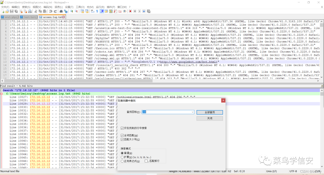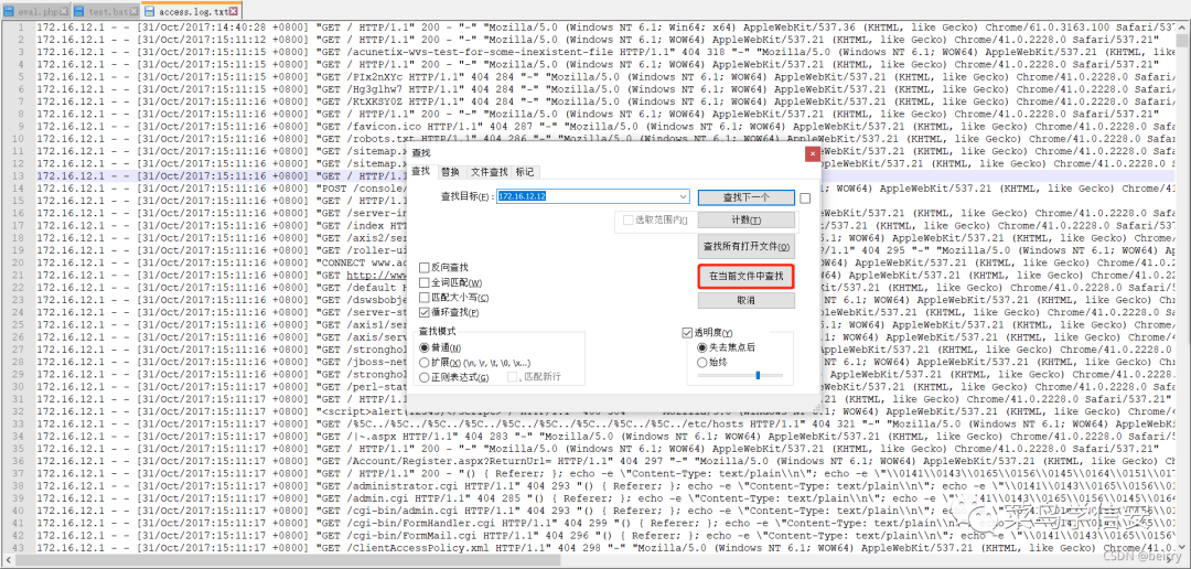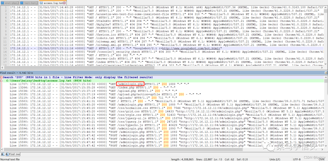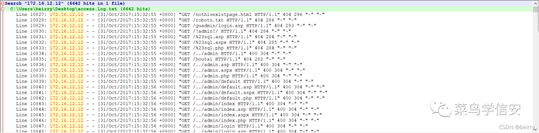 通过提示,我们应该重点关注IP为172.16.12.12的操作,将日志文件下载下来,具体分析。