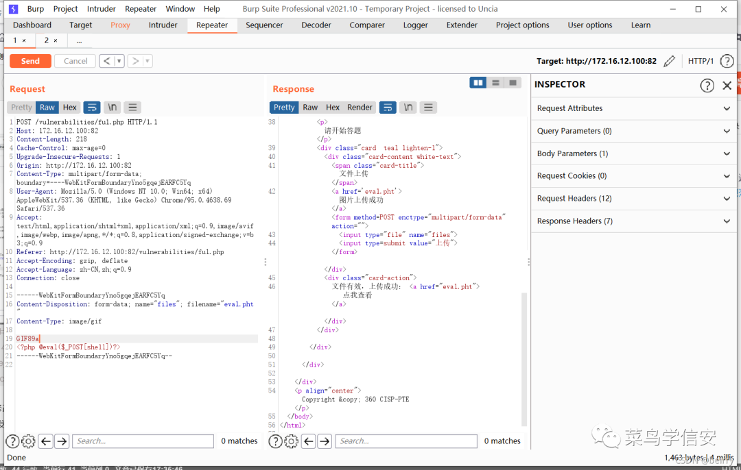 将文件后缀名修改成pht,将文件类型修改成image/gif 添加文件头GIF89a,点击发送