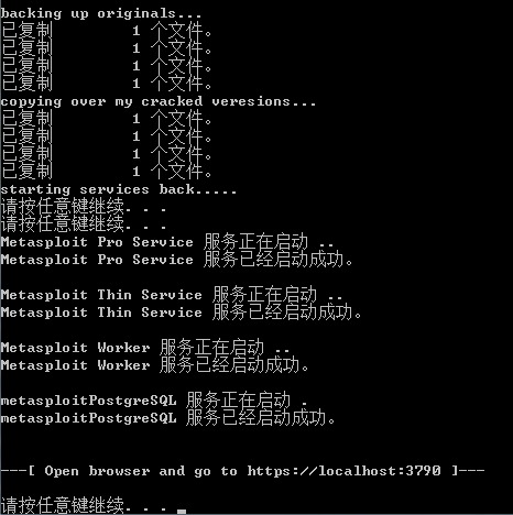 一、双击exe文件,一直点击下一步二、将“MetasploitPro\MetasploitCrack\MetasploitPro”里面的内容复制到安装目录,然后以管理员身份运行install.bat三