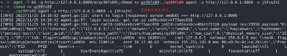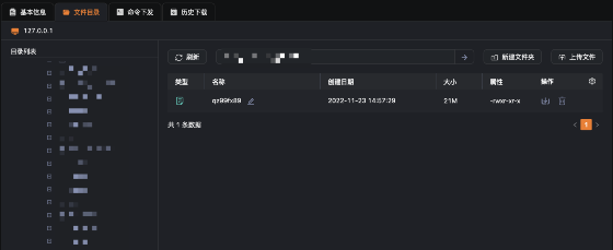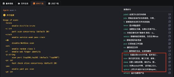 cat 查看指定文件内容cd 切换工作目录cp 对指定文件复制到新的指定位置download 下载Agent上的指定文件到控制端的文件列表中,如果目标文件已经存在将会以.1结尾exec执行系统命令或运行指定程序。别名: runexit Agent进程退出find 根据给定的文件名匹配指定目录下的文件,会递归查找,其中匹配部分仅仅为文件名findhash 根据指定Hash值匹配指定目录下的文件,会递归查找,其中Hash 支持 md5,sha1,sha256 会根据长度自动识别类型ifconfig 查看ip地址等信息,别名: ipconfig, ipjobkill 结束正在运行的任务jobs 查看正在执行的任务信息,只有下面的命令才可以查看exec、rsocks5、socks5、scan、download、find、findhashls 查看指定目录的文件列表信息lsroot 显示磁盘盘符mkdir 创建指定目录,如果父目录不存在将会自动创建mv 对指定路径进行重命名 别名:renamenetstat 查看网络连接信息,仅仅支持linuxps 获取进程列表信息pwd 打印当前工作目录rm 删除指定文件rmdir 删除指定目录,会递归删除rsocks 创建反向socks5代理,监听端口为控制端上 -A 参数默认为 配置文件中的地址platform_host, 端口为:reverse_proxy_server_port -p 在控制端监听的端口scan 执行主机发现,端口扫描,系统服务识别,弱口令爆破 HTTP站点发现,web指纹识别,文件/目录爆破,PoC扫描 等功能。sleep 设置 心跳包间隔,单位为s,默认为5Ssocks 创建socks5代理, 监听端口在Agent上upload 上传文件类别中的文件到Agent上的指定位置,如果目标文件已经存在将会打印错误信息whoami 显示当前用户名