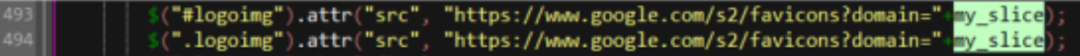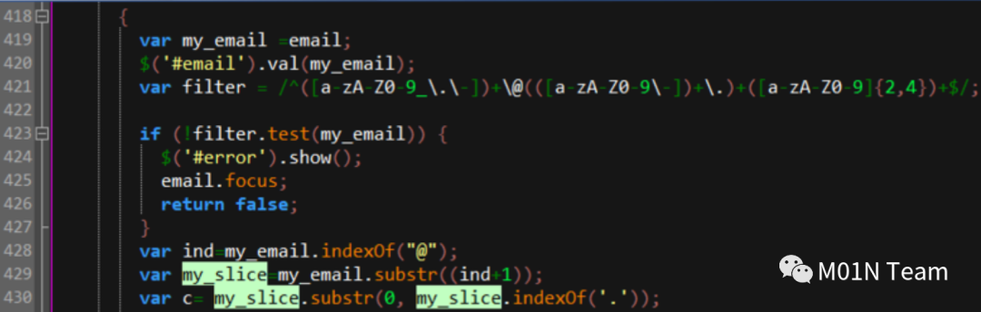 通过查看源代码,可以很明显的发现:攻击者在JavaScript中通过正则表达式获取受害者邮箱的域名,然后在页面中动态替换对应资源的链接地址,通过多个资源的动态调用实现自动变化网页样式的变色龙钓鱼页面。
