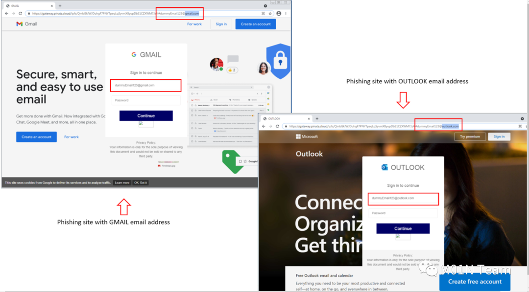 当受害者访问携带钓鱼url时,钓鱼页面会自动检测url后面附带的邮箱地址,用来帮助受害者填入邮箱地址,让钓鱼活动看起来更加真实。通过改变url后面携带的邮箱地址,可以看到这个钓鱼网站就像变色龙一样,通过更改和混合其网页样式图像来欺骗受害者。如下图,当我们在浏览器中输入电子邮件地址时,有四个明显的 Web 元素会发生变化: