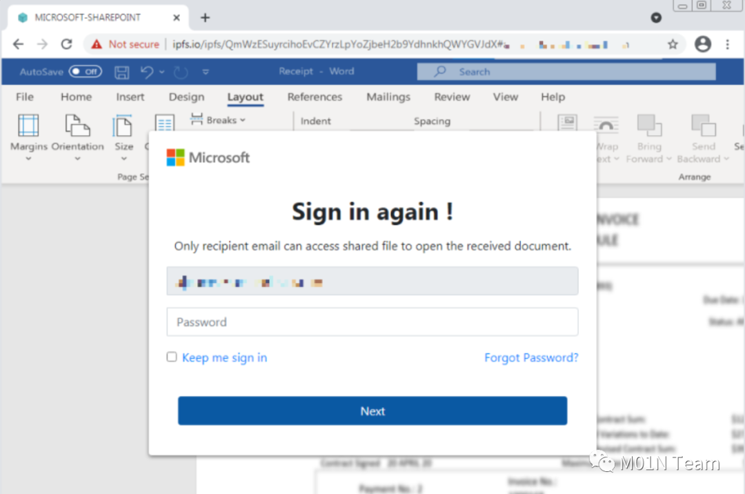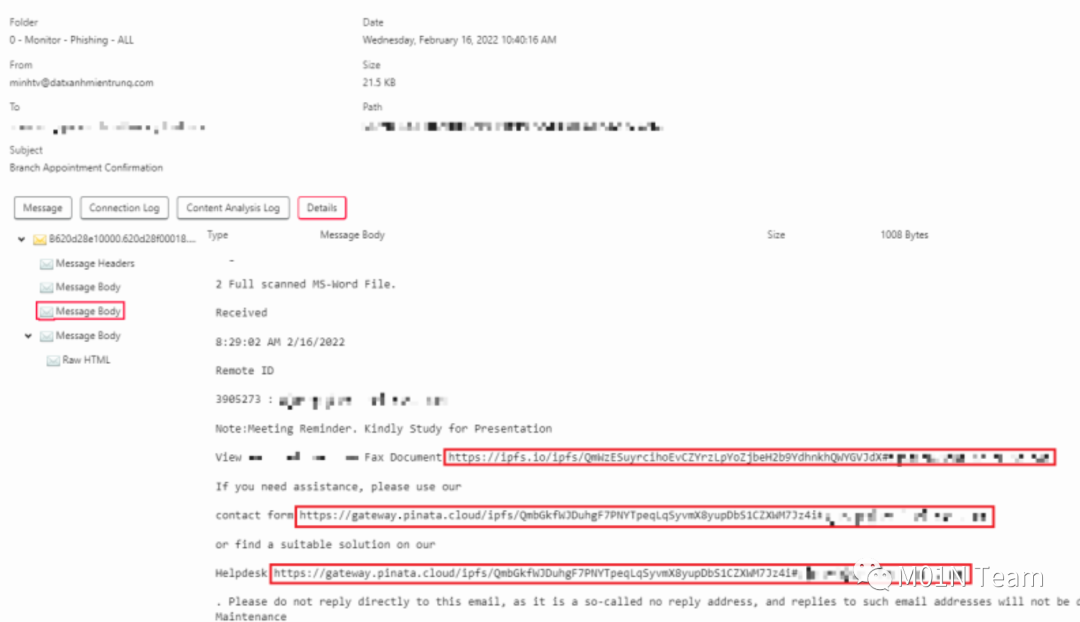 在下面的钓鱼活动中使用了IPFS进行钓鱼页面托管,IPFS是2015年创建的用于托管数据的点对点网络和协议,它建立在去中心化系统上,用户可以通过地址访问到托管的内容。由于多个IPFS节点可以托管内容,因此网络钓鱼页面可能会一直保持在线状态,为了删除这些恶意内容,网络防御者需要花大量的精力去访问托管内容的所有网关,并要求从其缓存中删除内容。