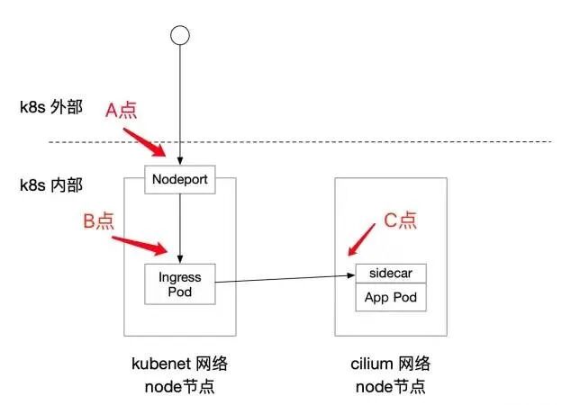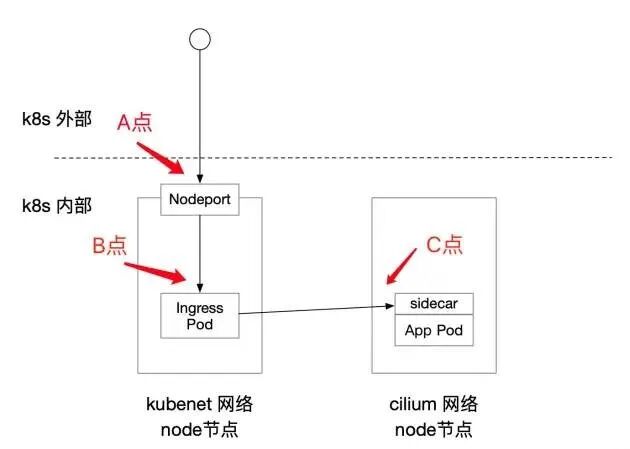 | cilium 节点上 pod 访问 kubenet 节点上业务 pod | 1. 发起请求的测试 pod 运行在 kubenet 节点上 2. 被测试业务 pod 运行在 cilium 节点上 3. 被测试业务 pod 配置有 networkpolicy | B 点 | 成功 |