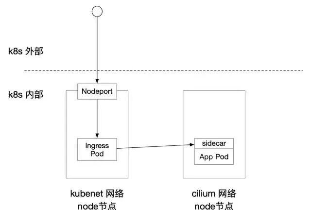 这里又来一个隐含的问题,既然在同一个 k8s 内,有 cilium 网络的节点,也有传统的 kubenet 网络的节点。为什么会出现不通呢?为了验证这个问题,我们又做了如下一个实验,还是上图: