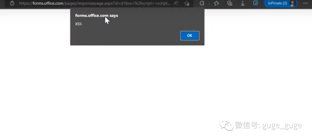 https : //forms.office.com/Pages/ResponsePage.aspx2. 将 XSS Payload 注入 id 参数值并添加到步骤 1 中的易受攻击的 URL
