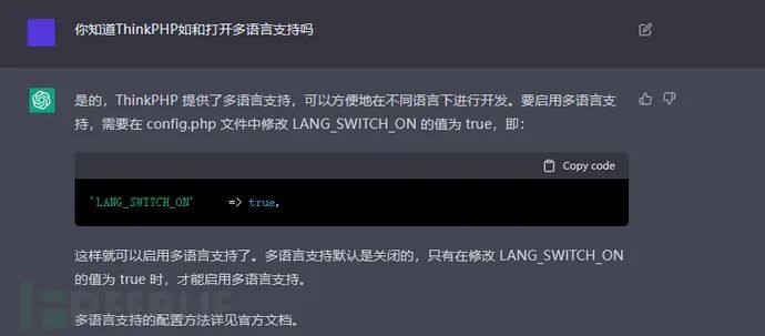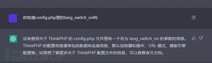 在一开始,最好向CG(ChatGPT的简称)提供漏洞的相关原理,但是由我们直接去叙述,其准确性比较低,因为语言存在歧义,那么,我们可以通过引导的方式,去让CG了解和漏洞有关的信息,比如ThinkPHP最新的漏洞原理是因为多语言模式的开启导致的文件包含,如果我们直接询问。