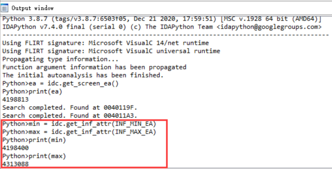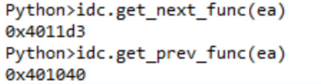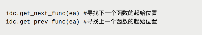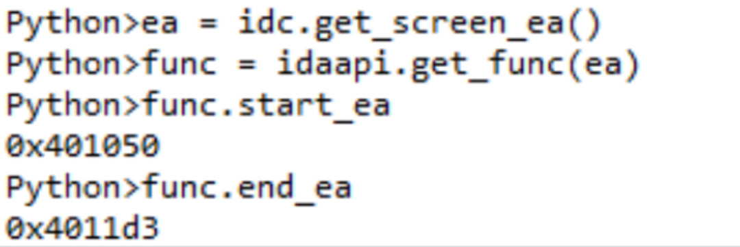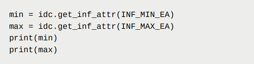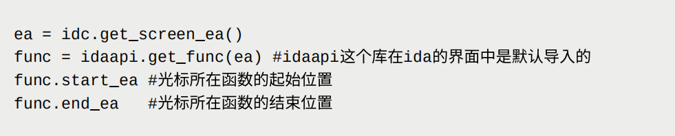 我们还可以获得ida中光标所在的区节段的起始位置和结束位置,这在我们做⼀些指定信息的遍历或者对于某个区节段搜索信息的时候也经常会⽤到。