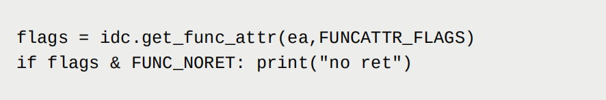 在静态分析中,我们偶尔会遇到没有ret的函数,⽐如某些纯汇编写的代码或者⽐较特殊的编译器的时候(部分hook也有这种情况),我们可以使⽤⼀下代码判断这个函数是否存在ret返回指令。
