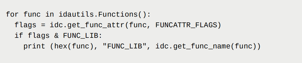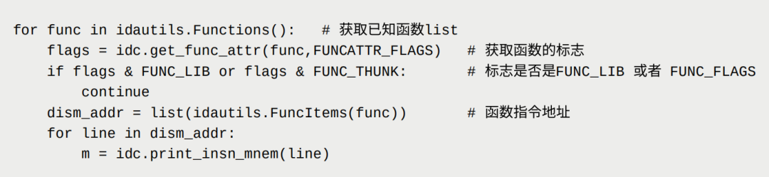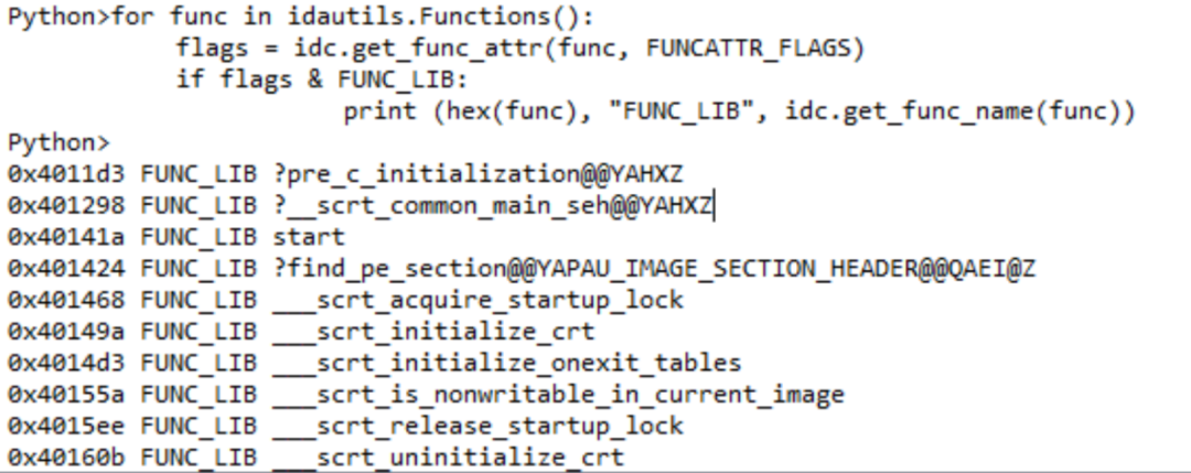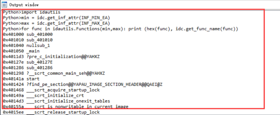 其中,idautils.Functions这个函数便是返回已知的函数的地址,我们在for循环中除了输出地址之外还⽤到了idc.get_func_name这个函数将指定的函数的地址转换成函数的名称。