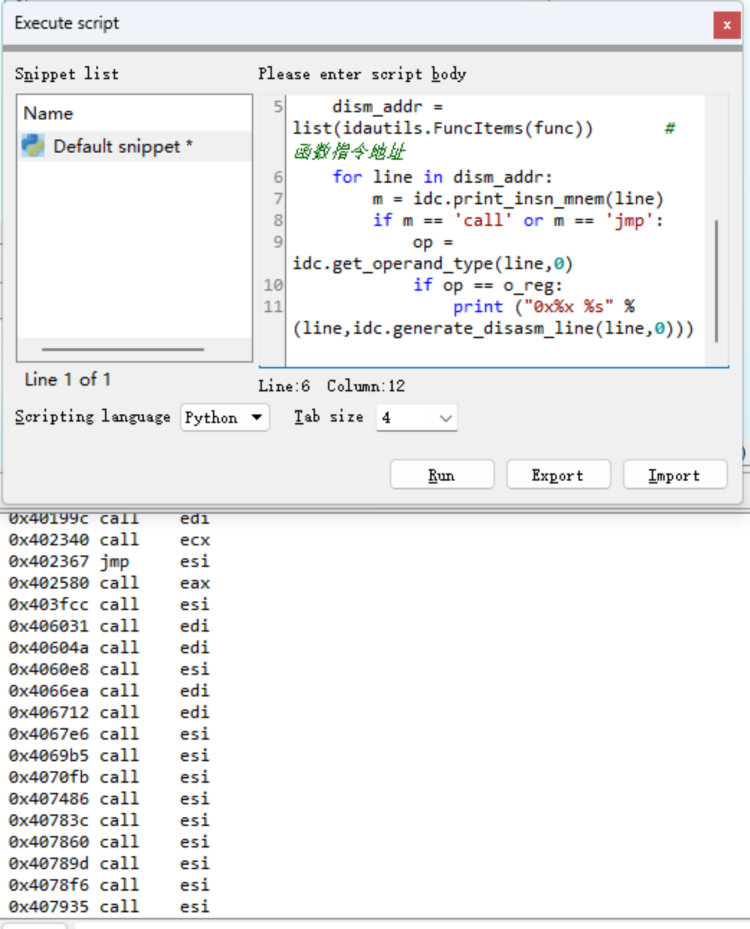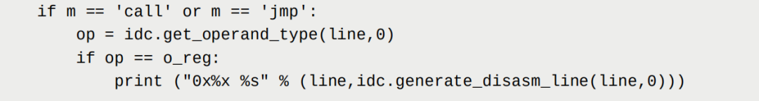 我们可以利⽤刚才学到的知识点写⼀些⽐较完整功能的脚本了,⽐如我们可以获取程序中所有⾮库函数或者⾮直接跳转的函数(flag为FUNC_THUNK),然后把每个函数中的所有call或者jmp语句提取出来,之后我们再判断⼀下如果call或者jmp⽴即数或者指针我们就不管,如果是跳转的寄存器我们就筛选出来。