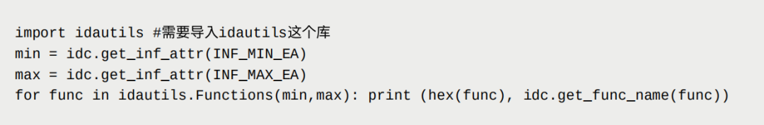 ⽐如我们可以遍历光标所在的区节段内所有ida已知的函数名和函数地址,⽤到我们刚才写的找起始位置和结束位置代码。