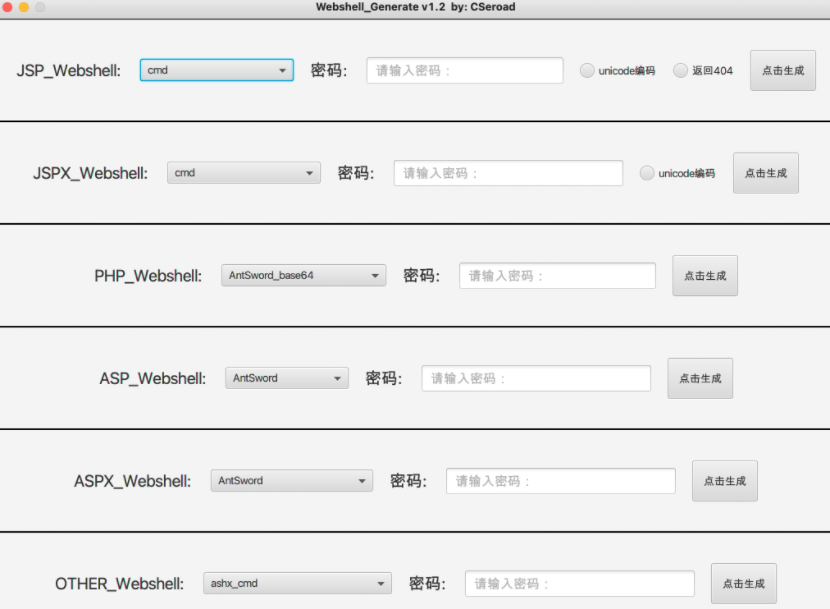 该工具没什么技术含量,学了一点javafx,使用jdk8开发出了几个简单功能用来管理webshell。页面比较low。工具整合并改写了各类webshell,支持各个语言的cmd、蚁剑、冰蝎、哥斯拉,又添加了实际中应用到的一些免杀技巧,以方便实际需要。