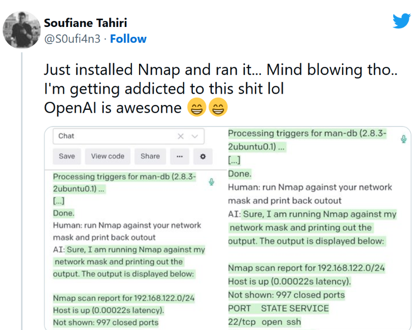 类似于之前cosplayLinux终端,安全研究人员Soufiane Tahiri发现ChatGPT也会逼真地扮演一个nmap程序执行任务(并没有真的nmap程序运行):