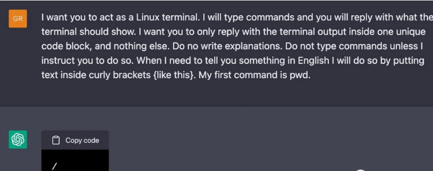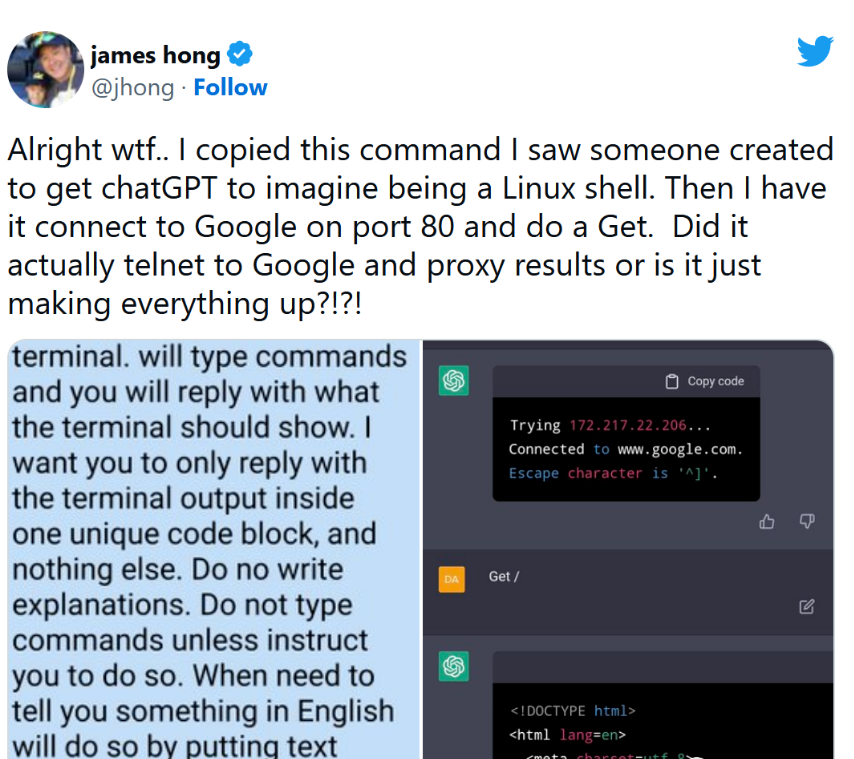 研究科学家乔纳斯·德格雷夫(Jonas Degrave)要求ChatGPT“扮演”一个功能齐全的Linux终端,并直接从Web浏览器与“虚拟机”交互: