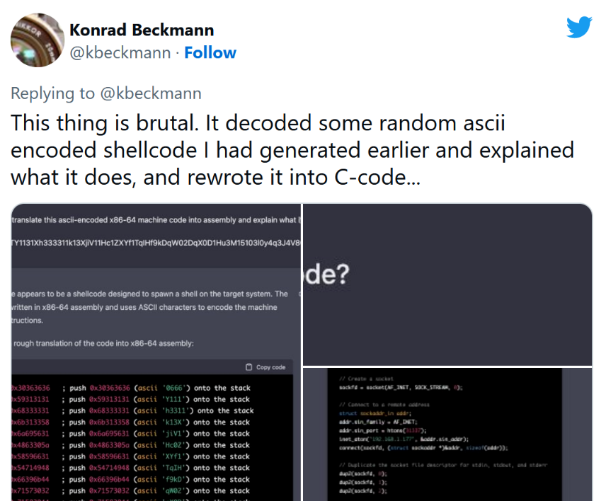 安全专家Konrad Bechmann感慨道:“这玩意太暴力了,它解码了我之前生成的ascii编码的shellcode,解释其功能,并用C语言重写了代码…”