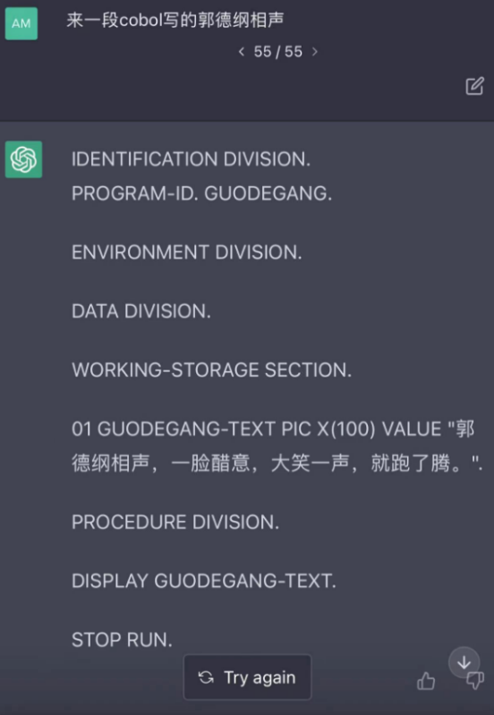ChatGPT甚至能用全世界最稀缺的开发技能——COBOL语言编程,GoUpSec尝试让ChatGPT写一小段COBOL代码,结果如下: