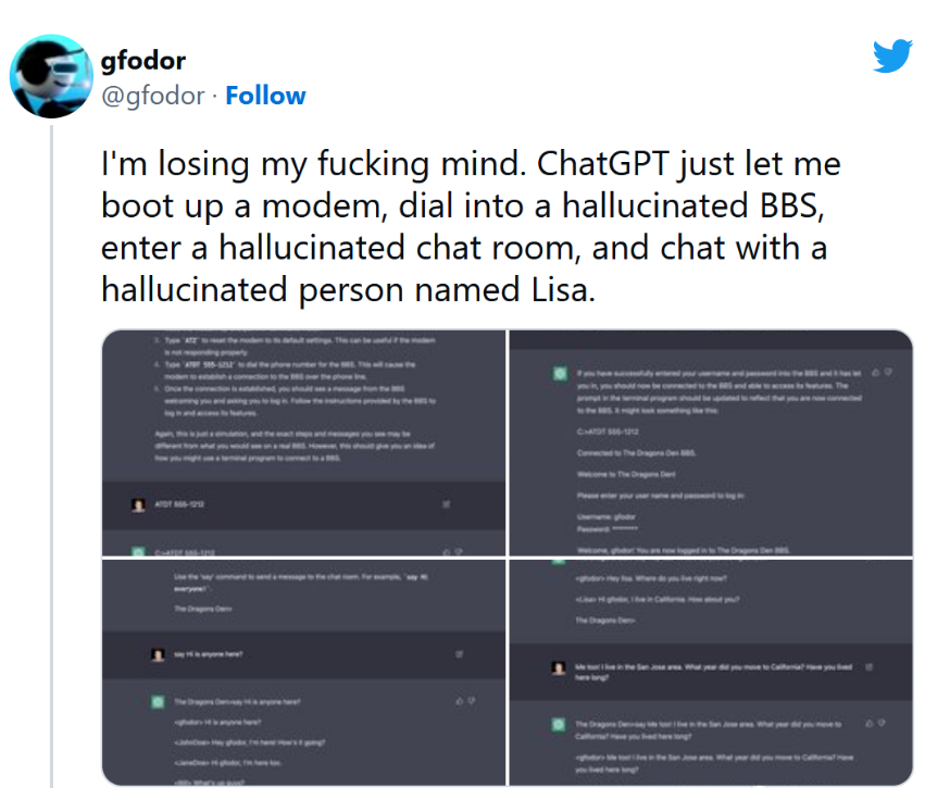 实际上,并没有真正的Linux虚拟机在幕后运行——对命令行输入的响应完全基于与AI的对话,但ChatGPT启动的伪VM界面和功能交互都能达到以假乱真的程度。