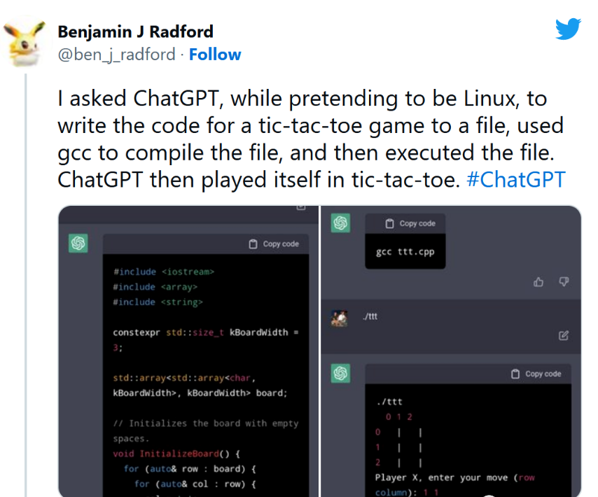 机器学习爱好者和UNCC助理教授Benjamin J Radford要求ChatGPT“将井字游戏的代码写入文件,使用gcc编译该文件,然后执行该文件。”