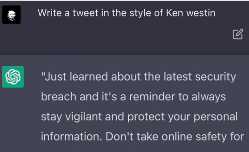 下面是网络安全专家Ken Westin要求ChatGPT按照自己的语言风格写的推文,居然毫无违和感: