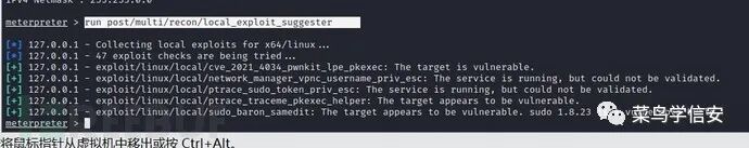 使用模块run post/multi/recon/local_exploit_suggester进行漏洞查询。