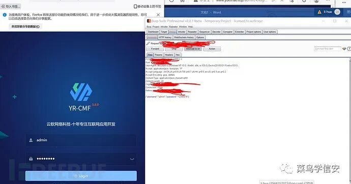 Burp上也要设置端口为8081,将Intercept设置为on输入账号密码点击登录就能拦截到数据包。